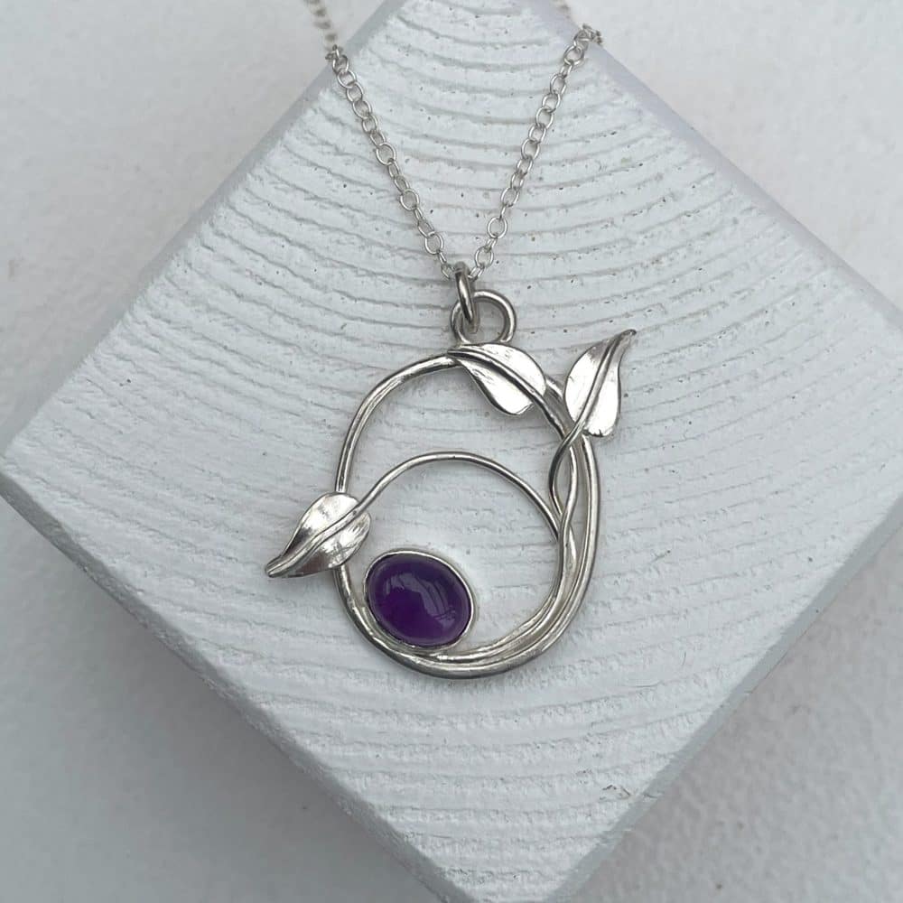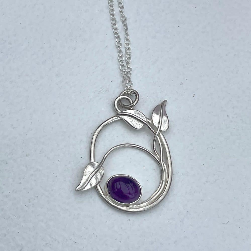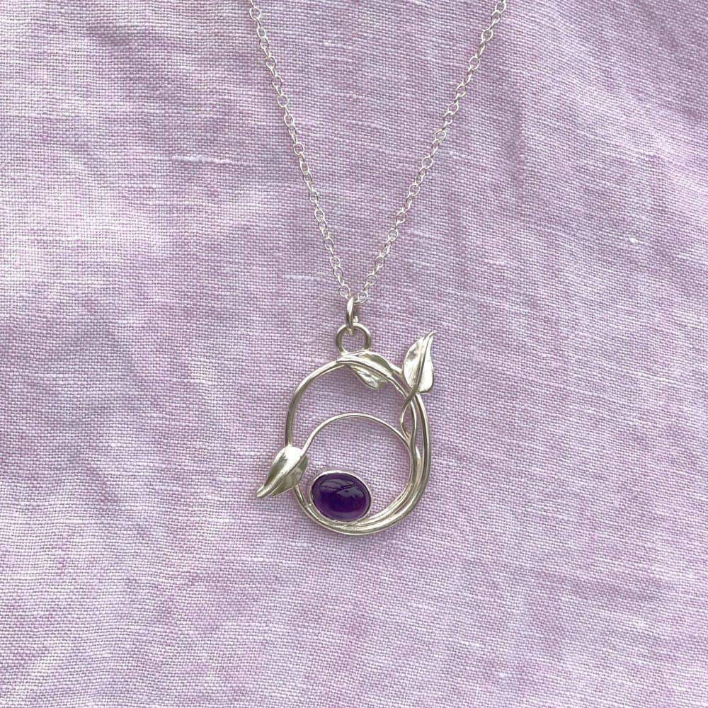 Discover the Handmade Amethyst Leaf Necklace. Handmade from Sterling Silver and featuring three entwined leaves framing a vibrant polished oval Amethyst gemstone.