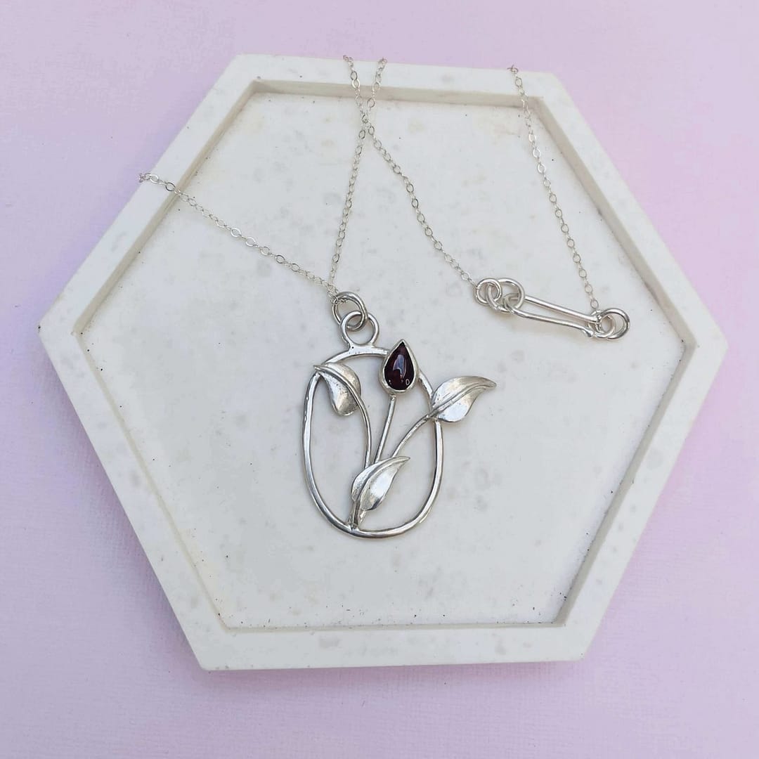 This sterling silver red garnet necklace captures the delicate beauty of a tulip in bloom. Flowing silver curves form graceful leaves and stems, embracing a single deep red garnet gemstone at the heart of the flower. The openwork design creates a light, airy feel, balancing elegance with natural movement.
