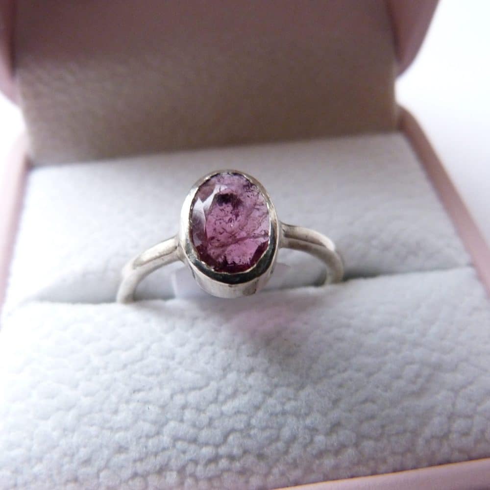 The deep, rich hue of the pink tourmaline beautifully complements the polished silver band. The inclusions within the Tourmaline adds visual texture and interest in the stone creating a piece that effortlessly adds a touch of sophistication to any outfit.